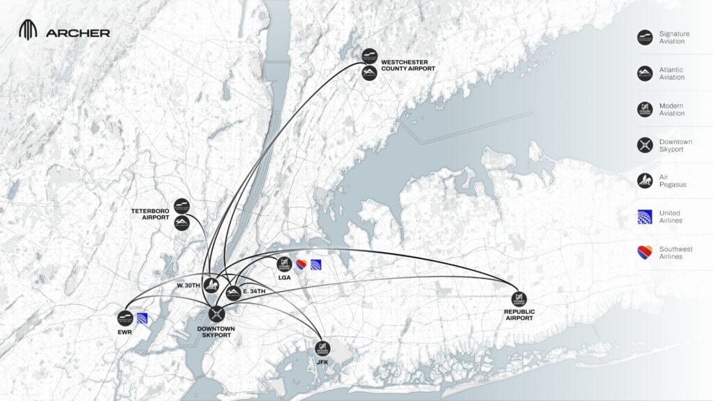 Ідея полягає у тому, щоб скоротити час у дорозі між Мангеттеном і найбільшими аеропортами міста — JFK, Ла-Гуардія та Ньюарк. Замість годинної поїздки наземним транспортом, пасажири зможуть дістатися за 5–15 хвилин за допомогою електричного літака Archer під назвою Midnight, повідомляє The Verge.